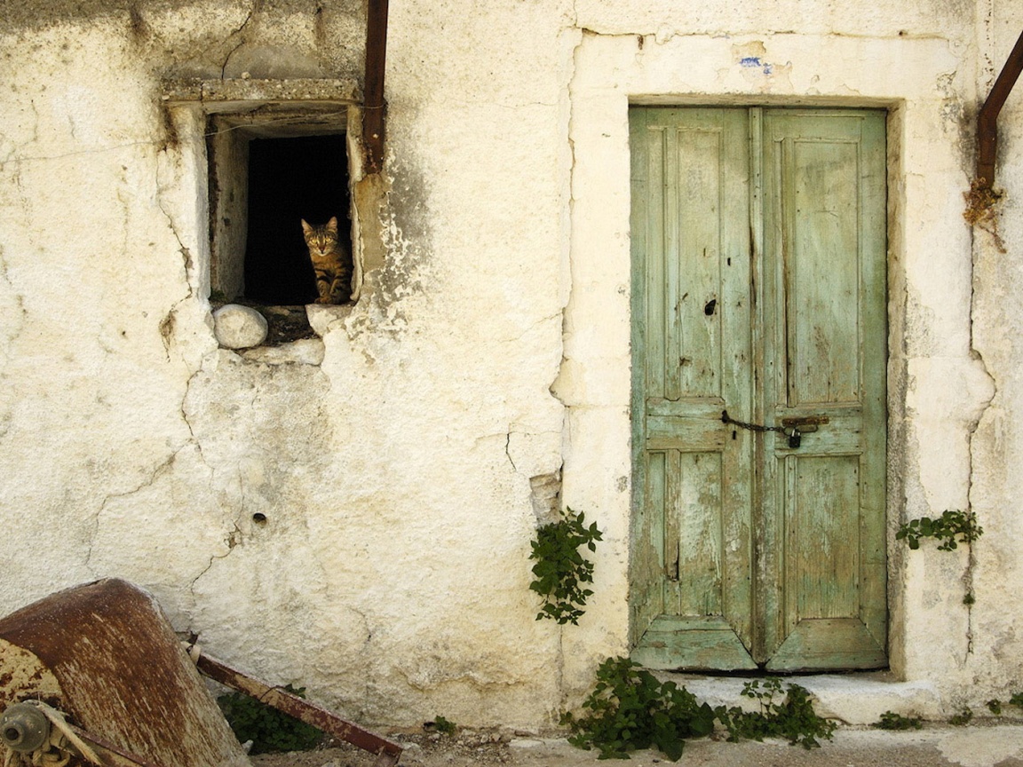 «Кот выглядывает из разрушенного дома»