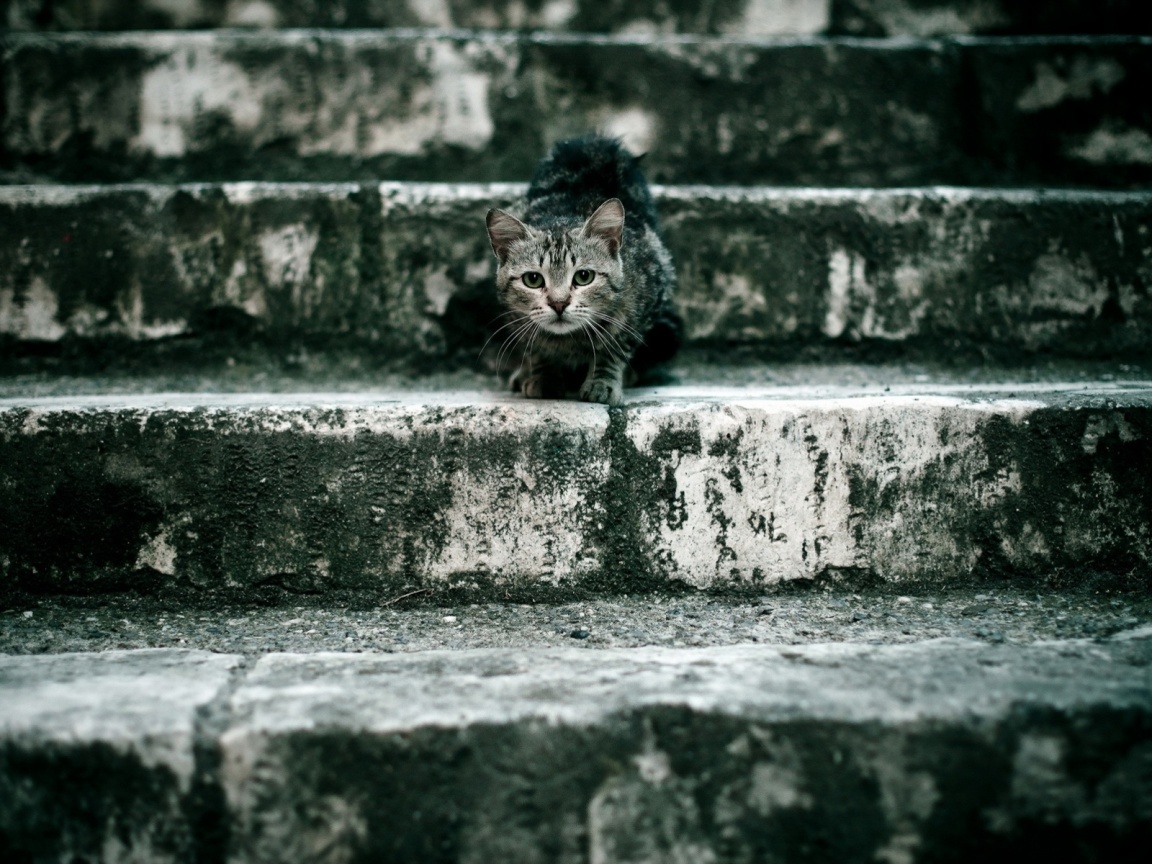 «Растрепанная кошка на ступеньках лестницы»