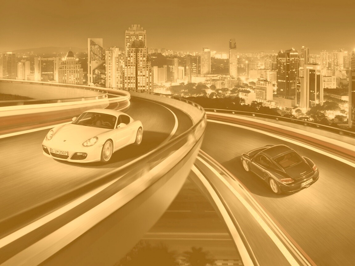 «Черный и белый Porsche на автомагистрале.»