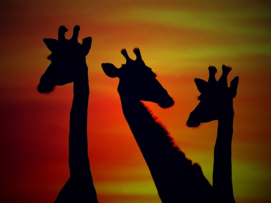 «Три силуэта жирафов на фоне неба»