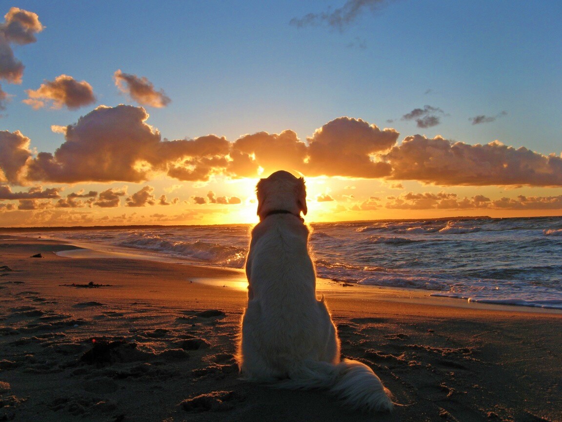 «Собака наблюдающая закат на пляже»