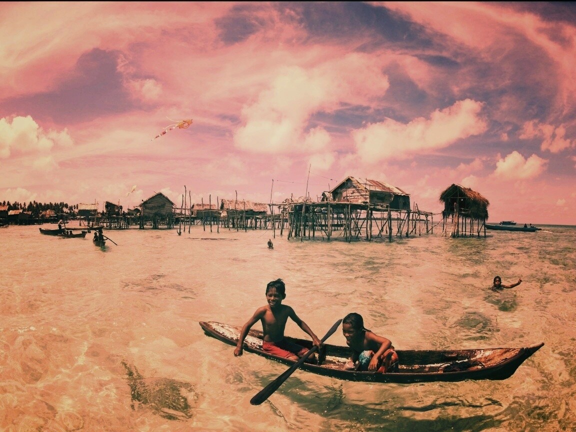 «Дети в лодке у поселения туземцев»