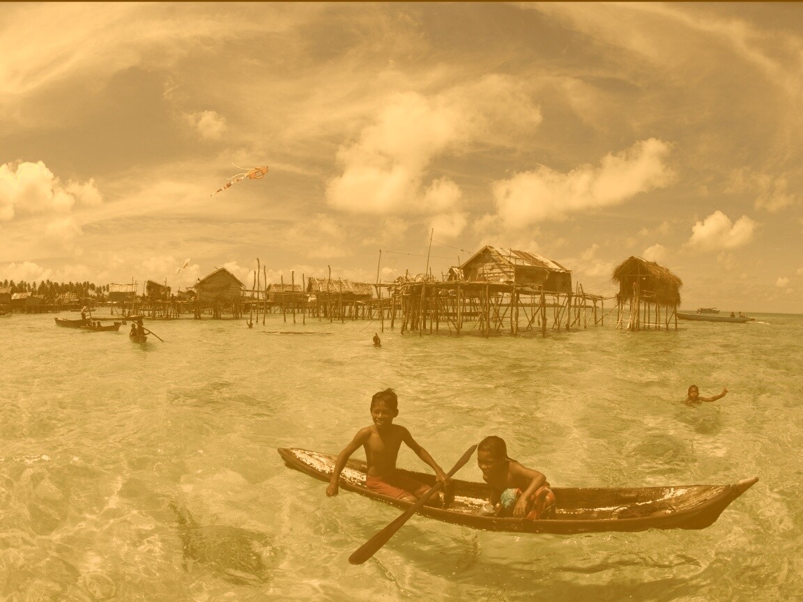 «Дети в лодке у поселения туземцев»
