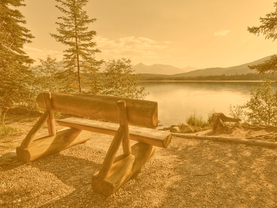 Обои для рабочего стола «Деревянная скамья на берегу озера» 1152х864 с фильтром kelvin (оригинал 2560х1600)