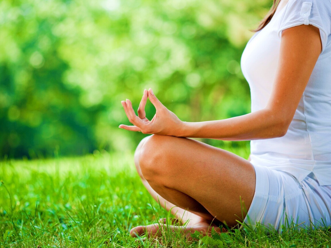 «Девушка медитирует в позе лотоса на траве»