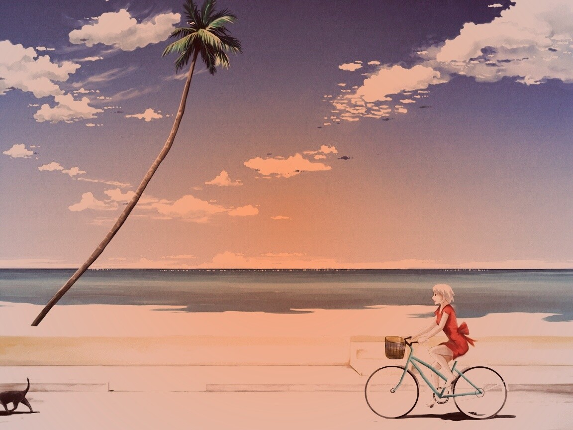 «Девушка едет на велосипеде вдоль берега»