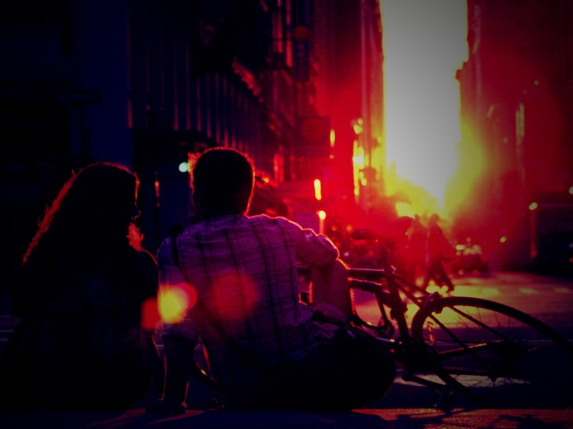 «Девушка и парень с велосипедом на закате»