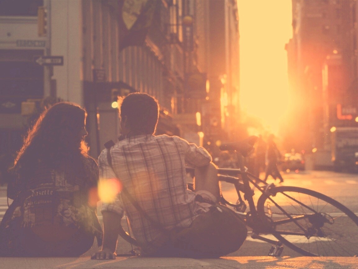 «Девушка и парень с велосипедом на закате»