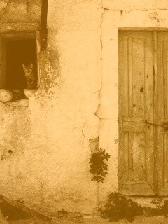 «Кот выглядывает из разрушенного дома»
