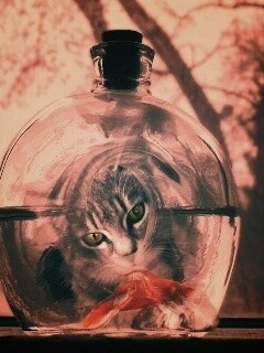 «Кот наблюдает за рыбкой в бутылке»