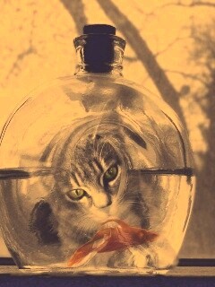 «Кот наблюдает за рыбкой в бутылке»
