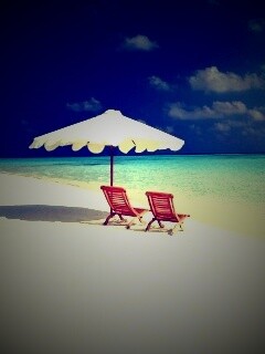 «Песчаный пляж с двумя жезлонгами»