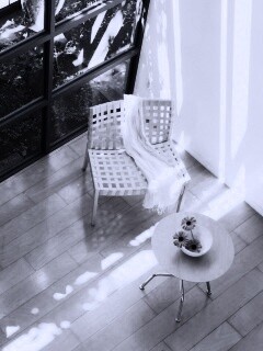 «Стул, столик и цветы в комнате»