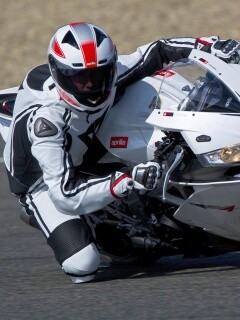 «Байкер в белой экиперовкена Априлия РСВ4»