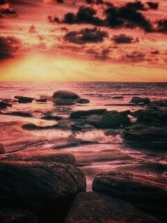 Обои для рабочего стола «Каменистый берег на закате» 240х320 с фильтром earlybird (оригинал 2560х1600)