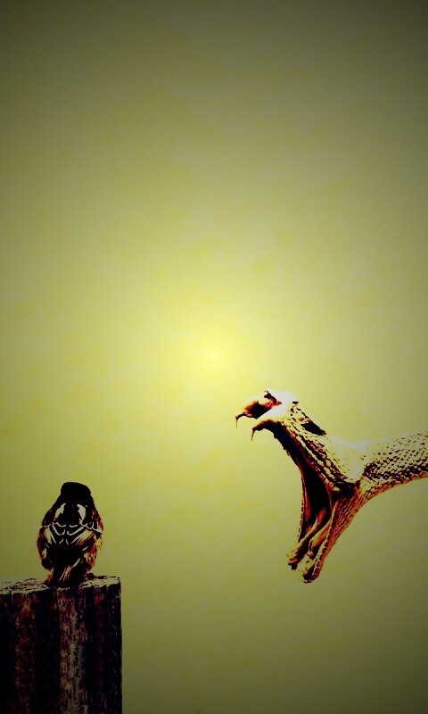 «Змея-коряга напдает на птичку»