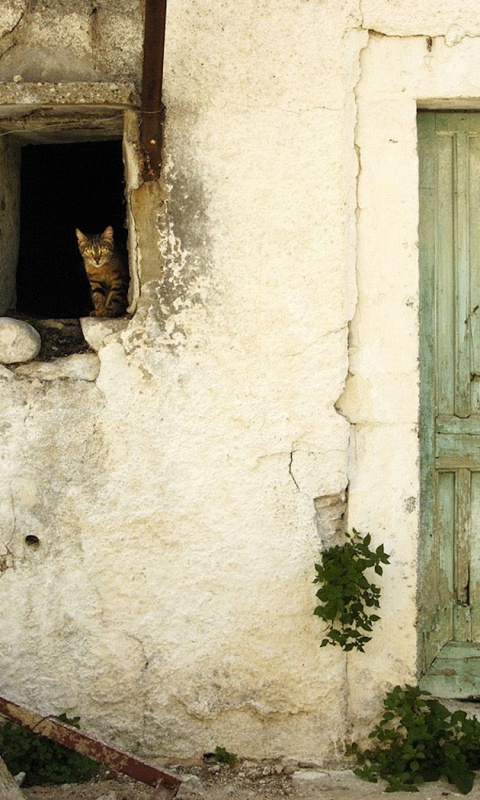 «Кот выглядывает из разрушенного дома»
