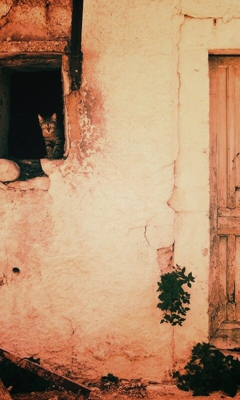 «Кот выглядывает из разрушенного дома»