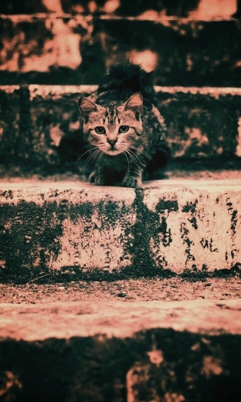 «Растрепанная кошка на ступеньках лестницы»