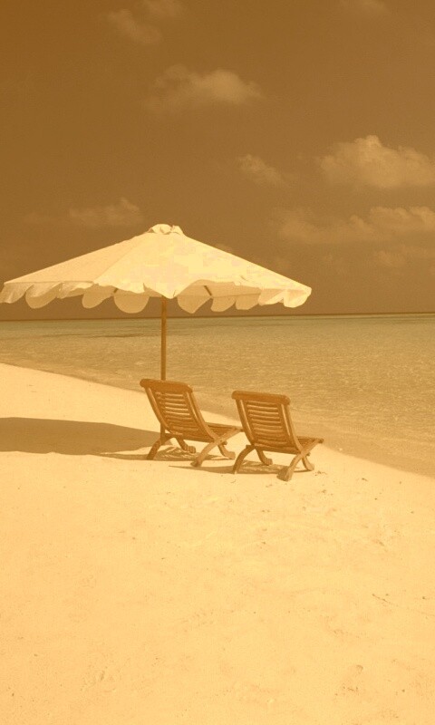 «Песчаный пляж с двумя жезлонгами»