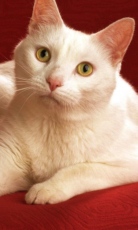 Обои для рабочего стола «Белой кот на красном диване» 480х800 с фильтром vibrance (оригинал 1680х1050)