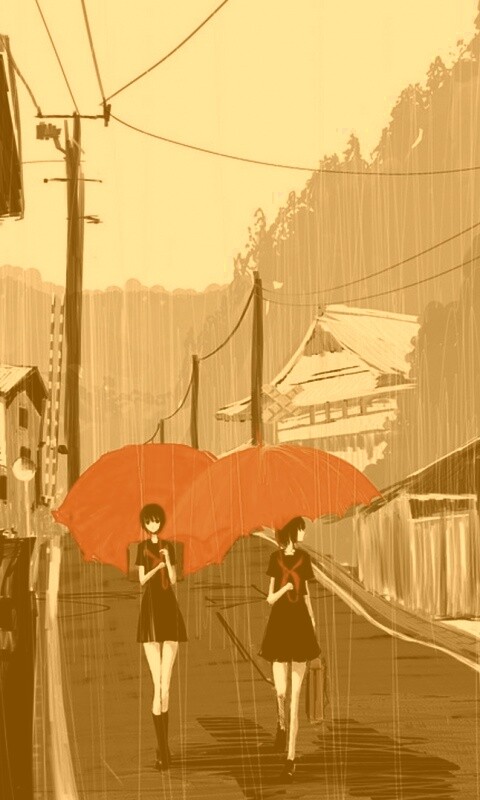 Обои для рабочего стола «Девушки с красными зонтами» 480х800 с фильтром kelvin (оригинал 1920х1080)