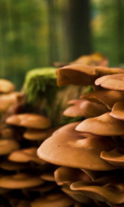 Обои для рабочего стола «Лесные грибы на пне» 480х800 с фильтром vibrance (оригинал 1920х1200)
