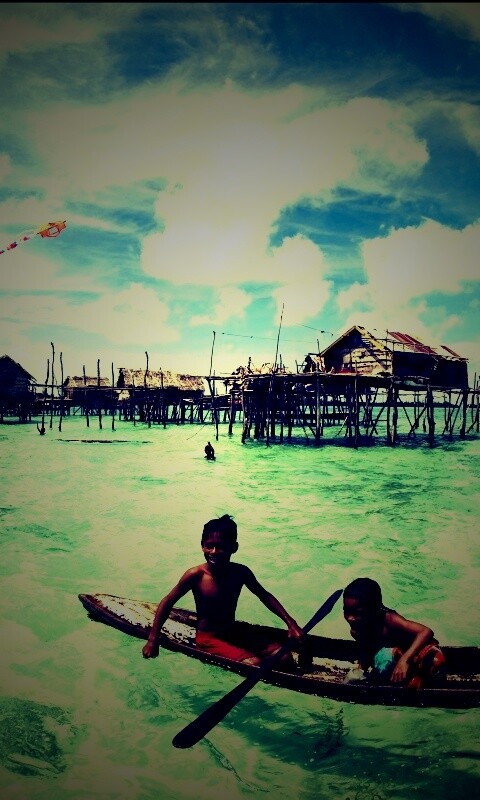 «Дети в лодке у поселения туземцев»
