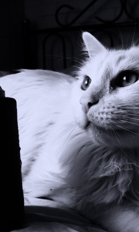 Обои для рабочего стола «Белый кот с катушкой ниток» 480х800 с фильтром gotham (оригинал 3648х2736)