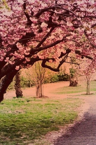 Обои для рабочего стола «Дорожка между деревьями» 320х480 с фильтром toaster (оригинал 1920х1080)