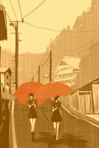Обои для рабочего стола «Девушки с красными зонтами» 320х480 с фильтром kelvin (оригинал 1920х1080)