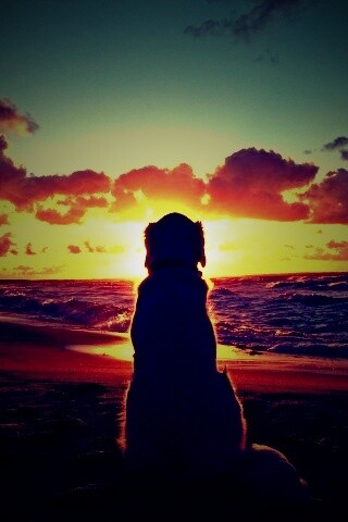 «Собака наблюдающая закат на пляже»