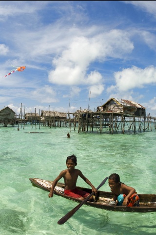 Обои для рабочего стола «Дети в лодке у поселения туземцев» 320х480 (оригинал 6000х4000)