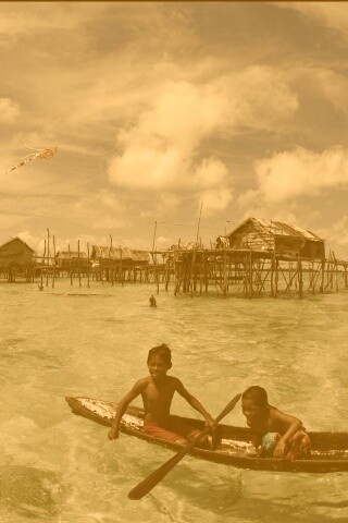 «Дети в лодке у поселения туземцев»