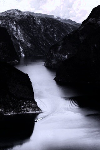 «Лодка на реке среди высоких гор»