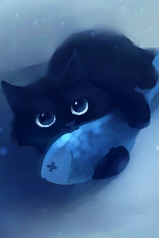 Обои для рабочего стола «Кот с рыбкой» 320х480 с фильтром vibrance (оригинал 1920х1200)