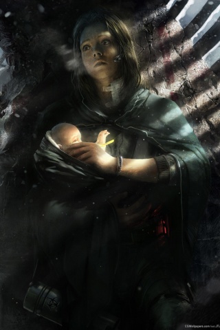 «Девушка с ребенком прячется от монстра»