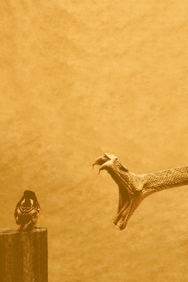 «Змея-коряга напдает на птичку»
