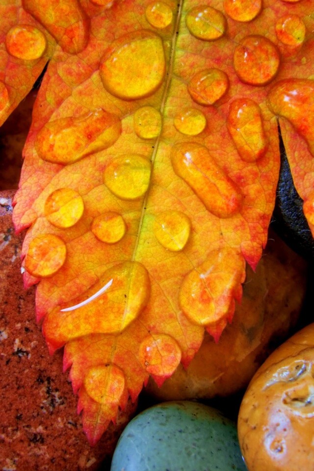 Обои для рабочего стола «Мокрые листья на камнях» 640х960 с фильтром vibrance (оригинал 2000х1333)
