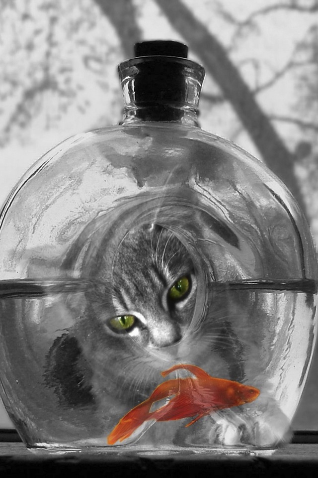 «Кот наблюдает за рыбкой в бутылке»