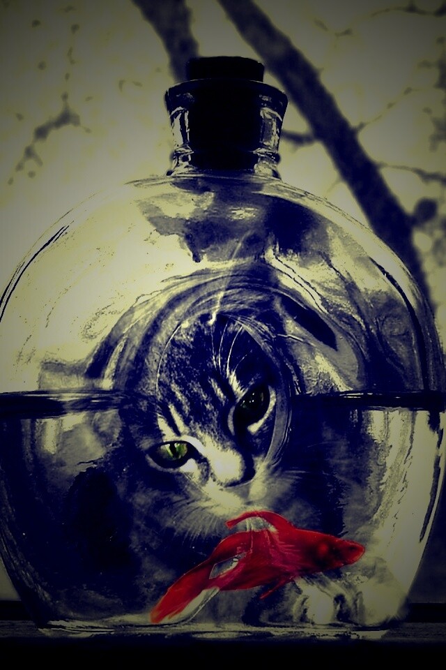 «Кот наблюдает за рыбкой в бутылке»