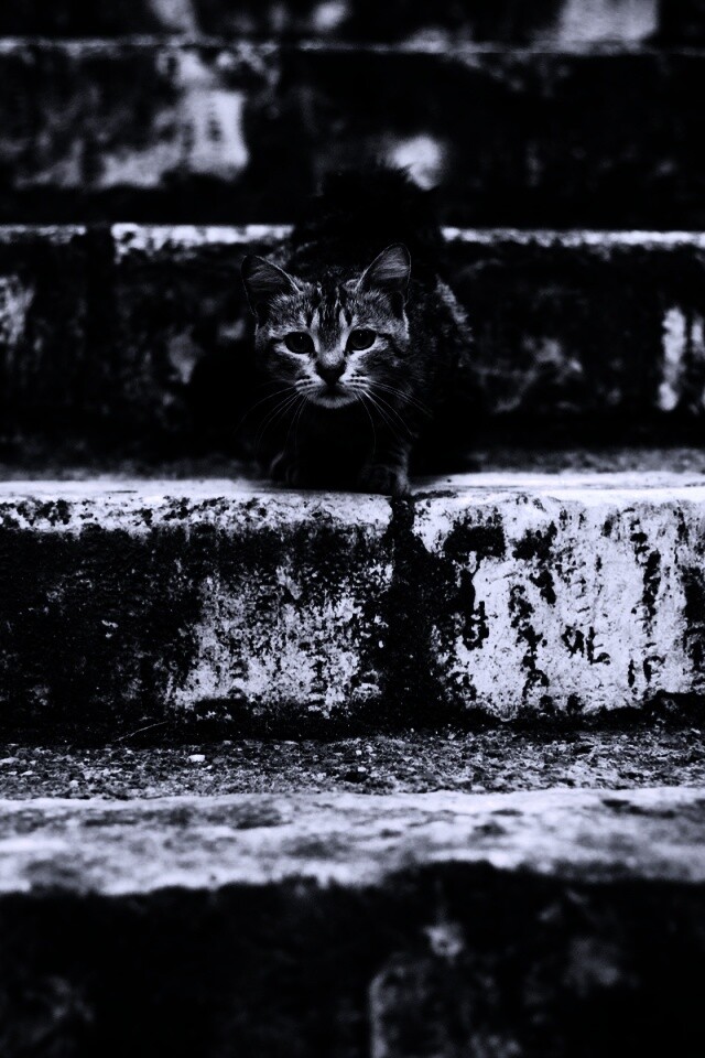 «Растрепанная кошка на ступеньках лестницы»