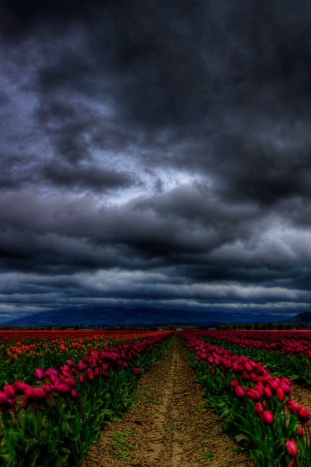 Обои для рабочего стола «Цветочное поле под грозовым небом» 640х960 с фильтром vibrance (оригинал 1680х1050)