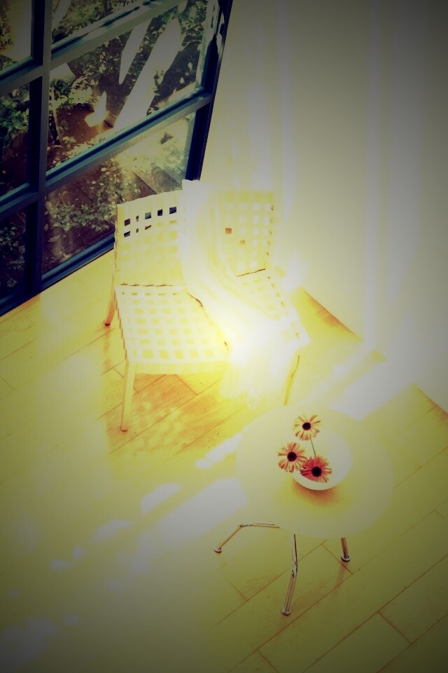 «Стул, столик и цветы в комнате»