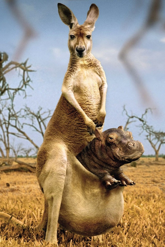 Обои для рабочего стола «Кенгуру с бегемотом в сумке» 640х960 (оригинал 1680х1050)