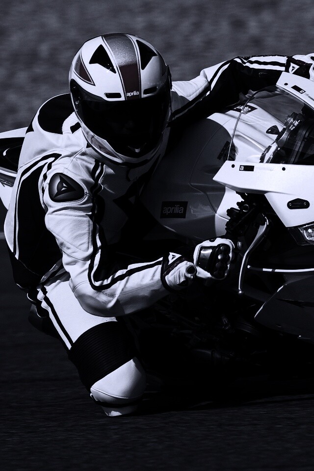 Обои для рабочего стола «Байкер в белой экиперовкена Априлия РСВ4» 640х960 с фильтром gotham (оригинал 3200х2000)