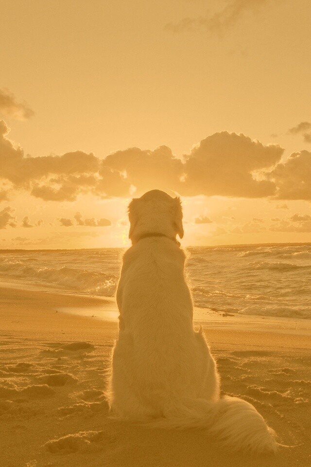 «Собака наблюдающая закат на пляже»