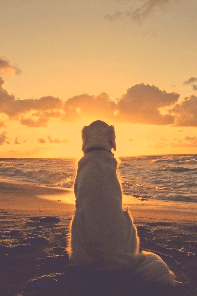 «Собака наблюдающая закат на пляже»