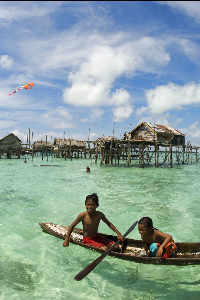 «Дети в лодке у поселения туземцев»