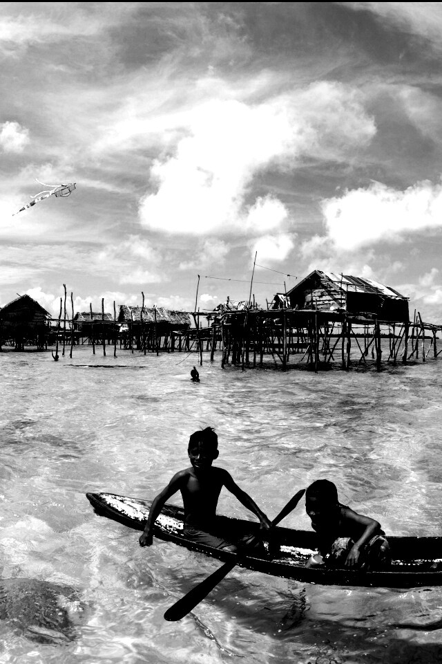 «Дети в лодке у поселения туземцев»